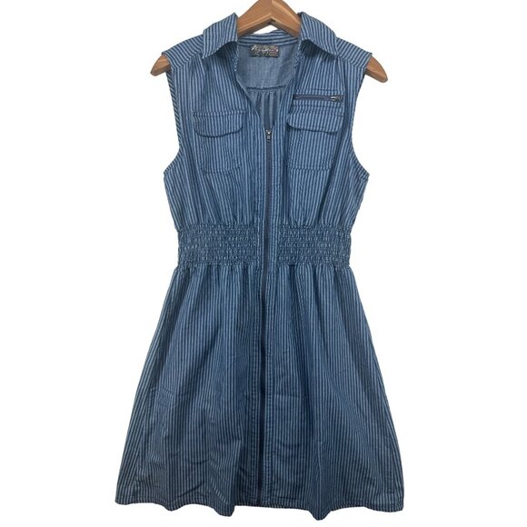 J Gee Dress Sz M? Blue Striped Shirt-Waist Zip-Up PolyCotton Slvless Pockets