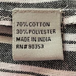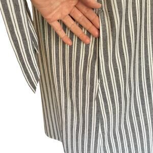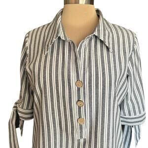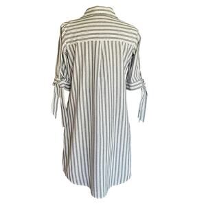 J Gee Gray White Striped Short Sleeve Shirt Dress LARGE Coastal Preppy Travel. Short sleeves with ties at cuffs. Buttons partially with 3 wooden buttons. Rounded hemline, about knee length. 70% cotton, 30% polyester. Side seam pockets. In excellent preowned condition. Machine wash.