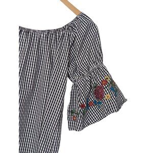 J Gee Shift Dress Women M Black White Check Embroidered On Off Shoulder Peasant