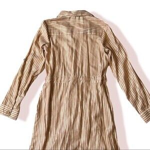 J Glee light brown midi shirtdress with white and gold stripes. Features long sleeves, a drawstring waist, a dipped hem with side slits, and chest and side pockets. The fabric is a lightweight rayon and cotton blend. Excellent new condition.