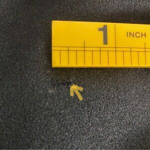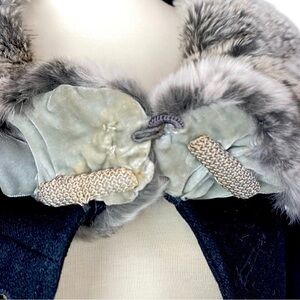 Please note there is a small hole in the folds of the right sleeve where the clothespin marks it. I have a closer up picture with a measuring tape. Also, there is a little discoloration on the underside of the fur collar as shown in last picture.