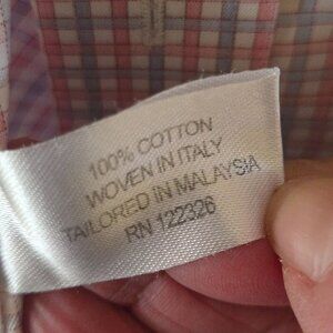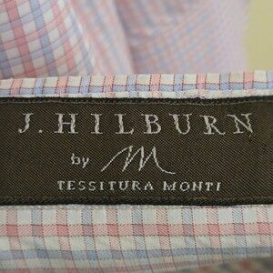 This lot includes two custom-made dress shirts by J. Hilburn, featuring purple/pink and blue plaid patterns. Woven in Italy by Tessitura Monti, these shirts offer a luxurious feel and fit for a sophisticated look. Quality Cotton, Monogram inside collar, Retail $228/ each. Pink blue has wear top back of collar as pictured