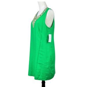 J Howard NWT Kelly Green Linen Blend Gold Lace Trim Sleeveless Shift Dress