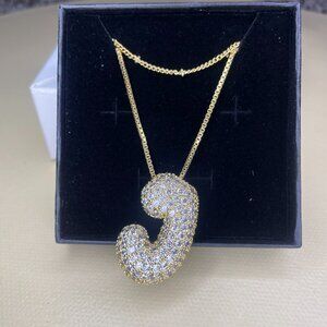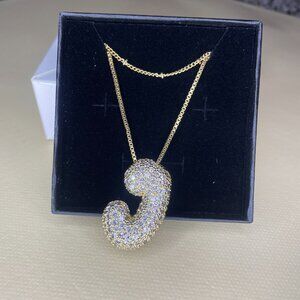 Pendant: The large, stylized initial "J" is completely covered (paved) in brilliant faux diamonds/crystals. The curved edges feature a delicate gold-tone border.