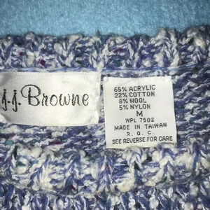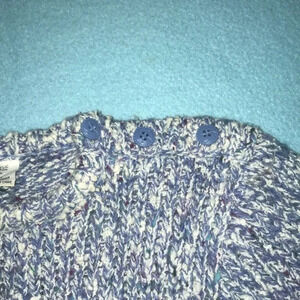 J. J. BROWNE vintage crewneck sweater button details on one shoulder. Blue and white with specks of turquoise and purple. Soft thick knit. No visible flaws. 65% acrylic 22% cotton 8% wool 5% nylon SZ M Excellent Condition Click ❤️ like for discount price
