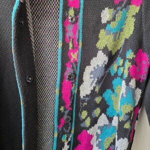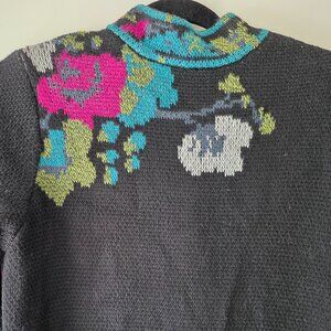 Beautiful coatigan / long duster sweater. Floral design. Front pockets. Round collar with single button. Hidden snap button closure down the front. Heavier weight great for a fall coat and layering.