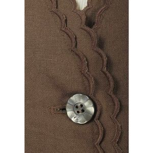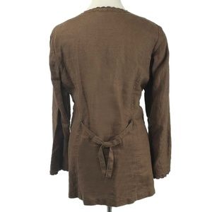 Lovely J. Jill brown linen double scalloped edge Lagenlook style tie back tunic jacket or topper. 4 buttons. V-neckline. Vented at the sides of the hem & has 2 pockets (still factory stitched shut). Excellent condition!