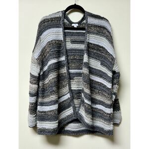 Open cardigan style with a chunky, textured knit. Dark gray tones to light gray. Dropped shoulder. Easy to throw on over just about anything for added warmth and a cozy feel.