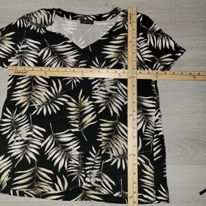 Keywords: Palm leaf print top, Black blouse, V neck top, Short sleeve blouse, Tropical print shirt, Casual top, Women's blouse, Summer top, Relaxed fit, Lightweight top, Print blouse