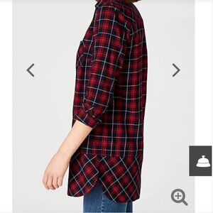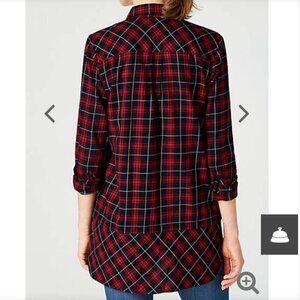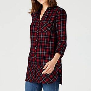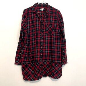 J. JILL Mixed Plaid Curved Hem Flannel Tunic Red Black White Button Down Shirt L