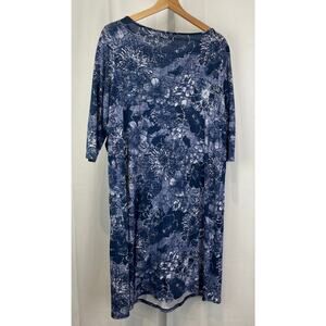 Scoop neck, elbow-length sleeves, pullover style, crossover panel skirt, pullover style, finishes near the knee, one front pocket. Soft cotton / modal in a blue / indigo floral print.