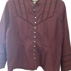 Rich in color and comfort, this burgundy button-up blouse from J. JILL blends timeless tailoring with everyday ease. Crafted from a cotton-spandex blend, it offers breathable softness and gentle stretch—ideal for layering, career styling, or polished casual looks. The button-up front, long sleeves, and subtle detailing at the chest and cuffs add refined charm to this wardrobe essential.