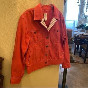 Pre-owned in great condition with no rips or stains. Women’s coral linen cotton blend jean jacket. Great with summer dresses, jeans, etc.. Comes from smoke and pet free home.