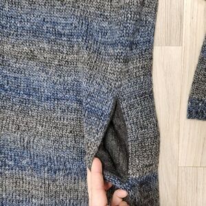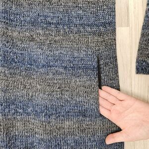 Elevate your style with this beautiful blue and gray striped J. Jill cardigan. Made from a luxurious wool and acrylic blend knit fabric, this cardigan is perfect for the colder months. Featuring a hooded design and open front, with pockets, this cardigan is a great addition to your travel or casual wardrobe. The long sleeves and mid-length cut provide both warmth and style.