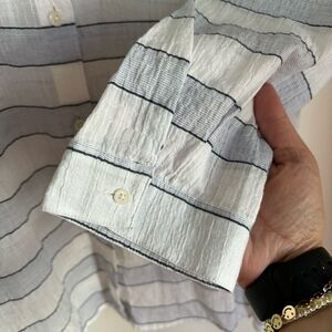 This shirt looks and feels super light weight! Would make a great top to wear on vacation in hot weather or even a beach cover up. Super classic, Crisp, and clean lines. Fun 3/4 sleeves. So easy to dress up for a night out or pair with jeans or a skirt! Almost like linen!