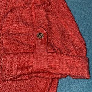 J. JILL linen blend v-neck sweater, short sleeve, button tabs, salmon coral color, buttons are wood with flowers on them (adorable detail), side slits, boxy loose fitting pullover.