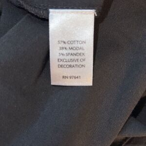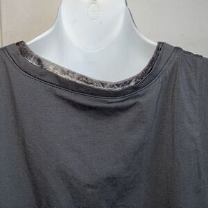 Grey cotton modal spandex blend, with grey velvet trim collar detail. Excellent condition. Washable. Size small, measures 18” from armpit to armpit and 26” from top of shoulder to bottom hem.