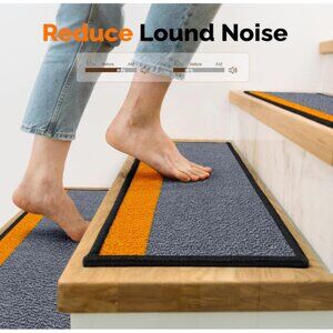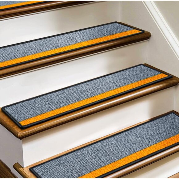 The J JIMOO Stair Treads are a set of 4 non-slip carpet runners designed specifically for wooden steps. Made with a low pile height and a solid gray and orange color, these rectangle-shaped stair treads are machine-woven and feature a normal pile type. With dimensions of 8''x30'', they provide a stylish and functional solution to prevent slipping on stairs. Made in China by the J JIMOO brand, these stair treads offer safety and durability for your home or garden.