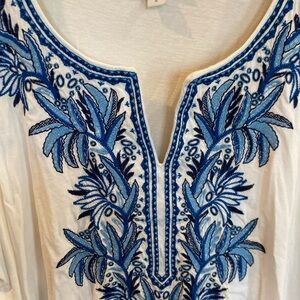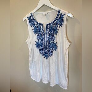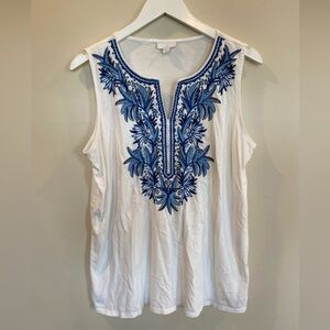 J JIll Tank Top Womens Medium White Blue Embroidered Cotton CottageCore BOHO