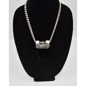 Striking Hand Crafted necklace by J. Jansen Designs. It showcases mix-media bold jet-Black Onyx and fine Austrian crystal, with a captivating rectangular pendant design that combines textured, non-tarnish silver and elegant 24k gold & non-tarnish Sterling silver plating accents. The adjustable silver chain is accented with artistic links, ensuring both style and comfort. Handcrafted and signed by the artist, this one-of-a-kind piece.