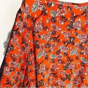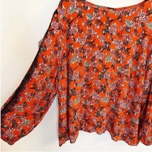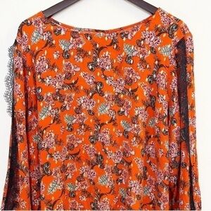 Excellent condition. Orange red gold Floral Multi color. Long sleeve with black lace trim. Woven blouse. Feminine print. Back keyhole button closure. Boat neckline.