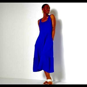 • Features: tiered design, midi length, curved square neckline, on-seam pockets, smocked back panel, elastic waistband, sleeveless
