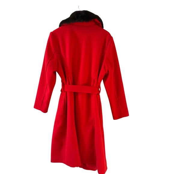 J Jason Wu Tailored Belted Coat Red Faux Fur Collar, size 1X. Good preowned condition, 100% polyester, Fully lined with pockets zippered front and matching belt. Lovely Statement color!