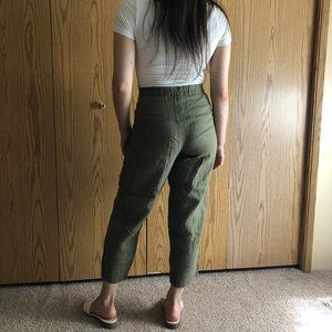 Designed in a light and breezy 100% linen, this summer-perfect loose, cropped pant keeps you cool and comfortable all season long. An elasticized drawstring waist ensures a comfortable fit. Front stitching highlights the side-inset panel for a casual feel. Angled front pockets. Faux fly. Gorgeous olive/ military green linen.