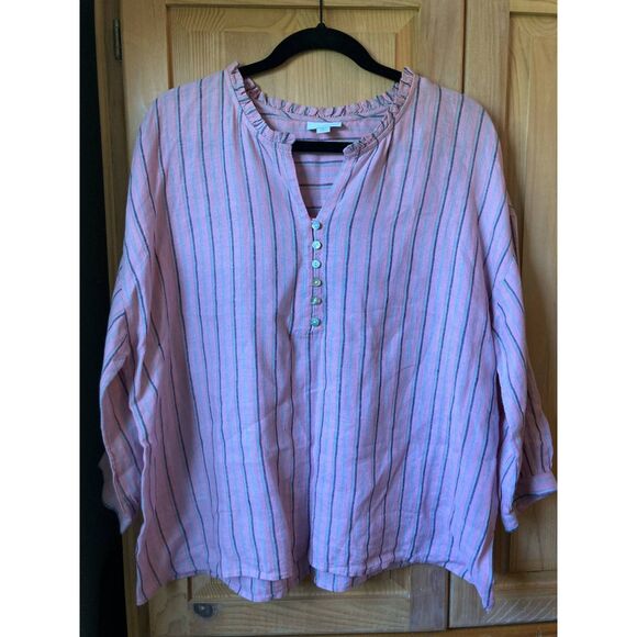 🧺J. Jill | 100% Linen Pink & black candy stripe peasant blouse | Large