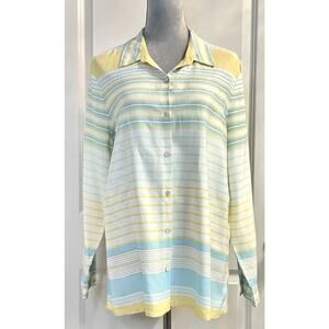 J. Jill 100% Silk Top Blouse Shirt Striped Button Up Blue Yellow Long Sleeve L