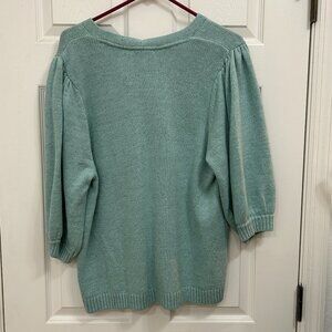 This J. Jill aqua cardigan sweater in size Large offers both comfort and timeless style. Featuring a V-neckline, 5 button front, and puffed 3/4 sleeves, it’s a versatile piece that pairs effortlessly with jeans, skirts, or workwear. Ideal for spring layering and as a fall transition piece, the soft knit fabric and relaxed fit make it perfect for year-round wear. Ribbed details add a polished touch, making it a wardrobe staple.