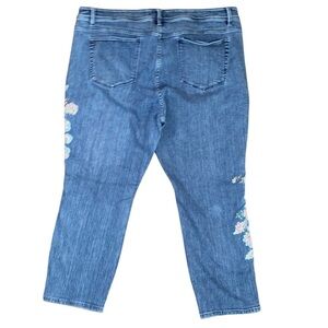 These J. Jill Authentic Fit capris feature cropped length, embroidered floral details on both legs, medium wash blue denim with intentional fading and whiskering, 5 pockets with deep front pockets, and zipper & button closure.