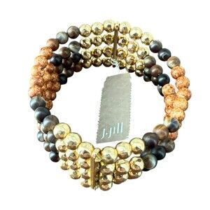 J. Jill, J Jill bracelet, J.Jill jewelry, multi strand bracelet, wrap bracelet, memory wire bracelet, beaded bracelet, beaded wrap cuff, coil bracelet, stacked bracelet, bangle style, cuff bracelet, gold tone beads, faceted gold beads, metallic beads, brown beads, black beads, tan beads, earth tone jewelry, neutral bracelet, mixed bead bracelet, natural stone look beads, jasper look beads, tiger eye look beads, matte beads, boho bracelet, bohemian jewelry, rustic chic, casual everyday jewelry, statement bracelet, chunky bracelet, layered bracelet, stretch bracelet, womens bracelet, womens jewelry, fashion jewelry, costume jewelry, fall accessories, autumn colors, modern boho, gift for her, new with tags, NWT, adjustable fit, one size bracelet