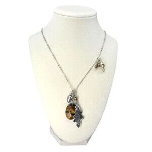 This J. Jill necklace has a charming nature-inspired woodland theme, featuring a mix of earthy and metallic elements. The silver-tone chain is accented with detailed charms, including: