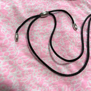 * A black adjustable cord with metallic end caps and a sliding closure for custom length and fit