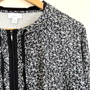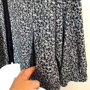 EUC In pristine condition! This jacket is from J. Jill's FIT athletic / athleisure line. The fabric is lightweight and airy (I believe this fabric is also water-repellent, but I'm not positive). It has a black background with a white and aqua ditzy floral print.