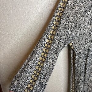 Comfortable peasant style top from J. Jill with a round neckline, 3/4 sleeves, quarter down button front and floral motif. This blouse has a delicate yellow floral stripe down both sleeves and sides that provides a nice detail. The relaxed, flowy design makes for a comfortable flattering fit.