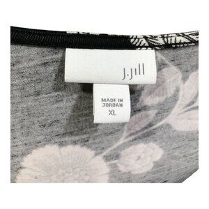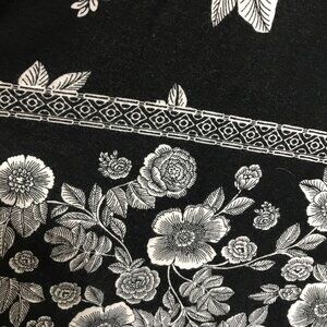 Elegant black dress with white floral pattern. Features a V-neck and three-quarter sleeves. Perfect for any occasion.