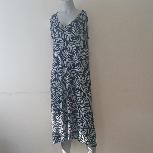 Chic maxi dress with a bold leaf pattern. Sleeveless design for versatile wear.