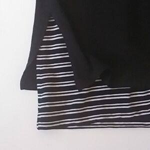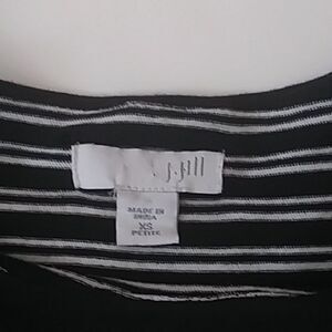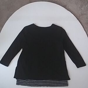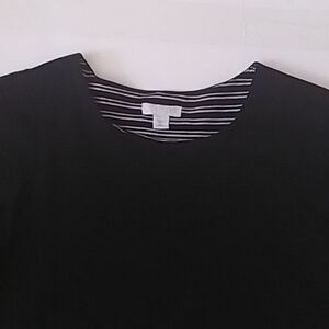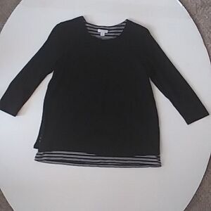 J.jill black layered look casual blouse that feels like a soft cotton tee shirt but looks like dress casual sophisticate all occasion wear. Slip this two for one no decisions involved number over your head and put on almost any kind or color of bottom on and you look instantly like you took the time to combine an outfit. And, you'll look great in no time at all. In a busy season of life this is a great way to keep yourself looking and feeling great. The neckline begs for a simple statement necklace for extra style points. So easy, comfortable, stylish and versatile.