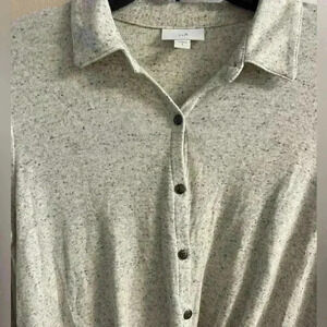 Excellent condition J Jill popover blouse with a 1/4 button-up design and crossover style. Made from a soft Supima cotton and modal blend with a speckled pattern.