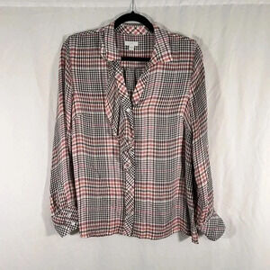 J Jill Blouse Women's Small Pink White Button Up Long Sleeve Vneck Rayon