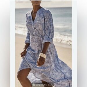 J. Jill Blue White Paisley Stripe Embroidered Long Cuffed Sleeve Caftan Maxi Dress - Easy wear beachy dress for the summer! Add Sandals, sneakers or go barefoot!