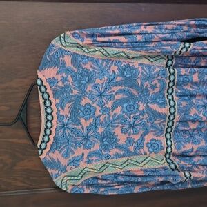 J. Jill Blue and Coral Floral Embroidered Boho Tropical 3/4 Sleeve Blouse LP