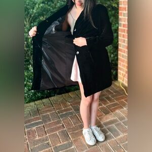 Step out in style with this elegant black velvet coat. Perfect for any occasion, this coat offers both warmth and sophistication. A must-have addition to your wardrobe. Size Petite Medium by J. Jill. Lined, embroidered back, lapel collar, buttons up the front. Measures 20 inches pit to pit and is 33 inches shoulder to hem. There are no tears or holes. This item shines as you can see in the photos that it reflects light.