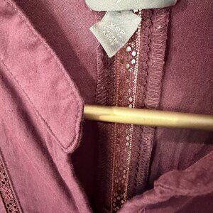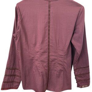 🎨 Color/Detail: Burgundy • Button‑up front • Long sleeves • Subtle chest/cuff detailing