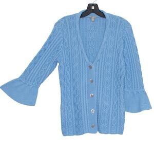 J Jill Cardigan Sweater 3/4 Bell Sleeve Cable Knit Cottage Y2K Preppy Blue Small