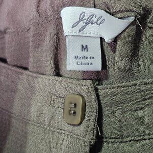 Chic J. Jill cargo pants in olive green with a stretchy waist and unique embroidered detail. Perfect for stylish, casual wear. Women's size medium.