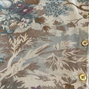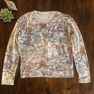 Preowned condition. Brand/size tags have been removed. Silk/Cotton/Cashmere blend. Pretty floral scene print. Shell buttons down front. I’m listing as a medium, but please see measurements for accurate fit!