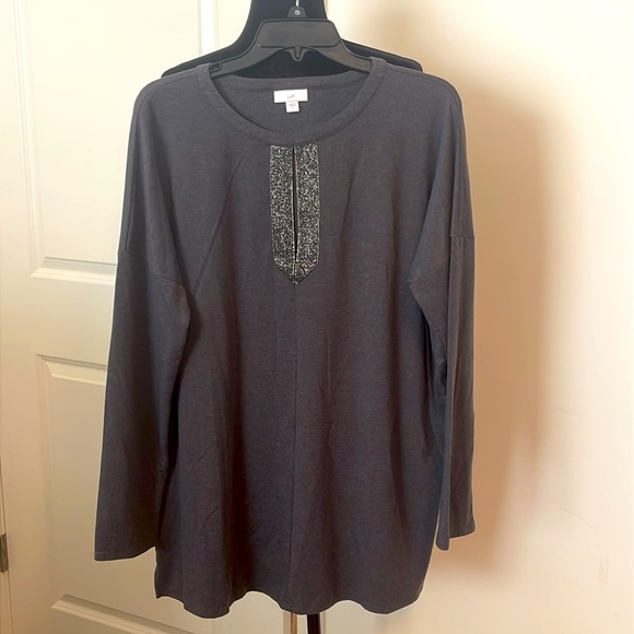 J. Jill Charcoal Gray Silver Metallic Sparkle Keyhole Soft Knit Tunic Top Size L